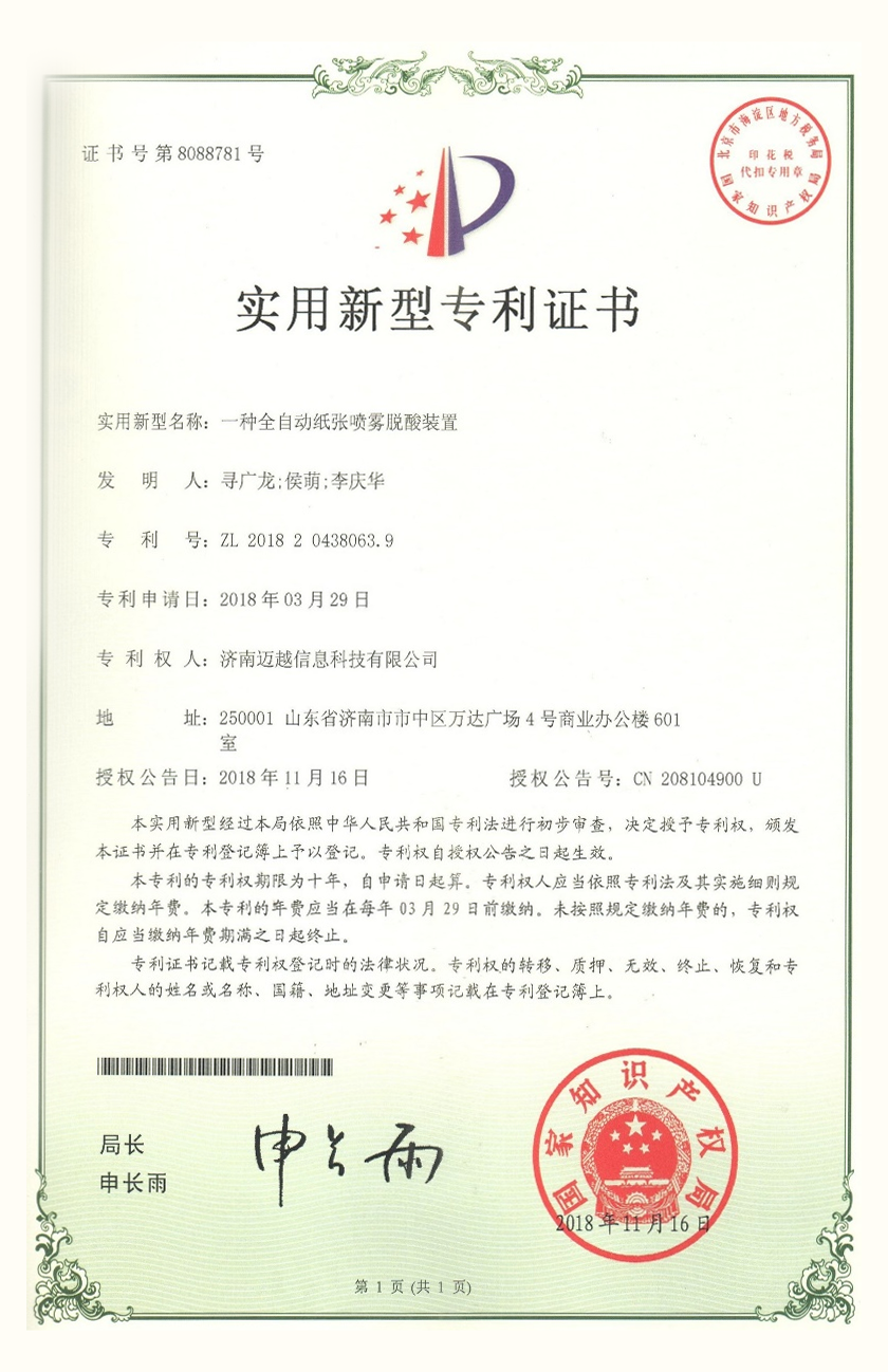 濟(jì)南邁越榮獲“一種全自動(dòng)紙張噴霧脫酸裝置”實(shí)用新型專利證書