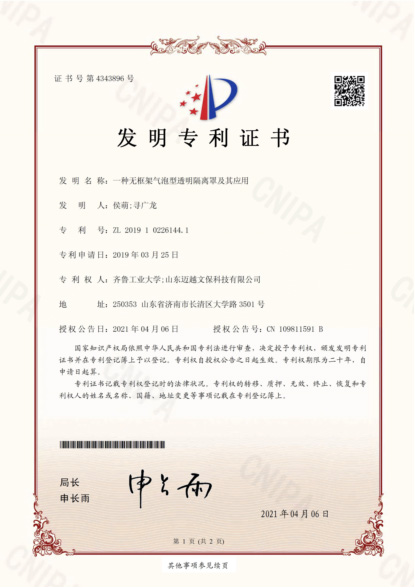近日,山東邁越文??萍加邢薰韭?lián)合齊魯工業(yè)大學(xué)申報(bào)的“一種無(wú)框架氣泡型透明隔離罩及其應(yīng)用”(專利號(hào):2019102261441)獲得發(fā)明專利授權(quán),由國(guó)家知識(shí)產(chǎn)權(quán)局于2021年4月6日正式頒發(fā)了專利證書(shū)。